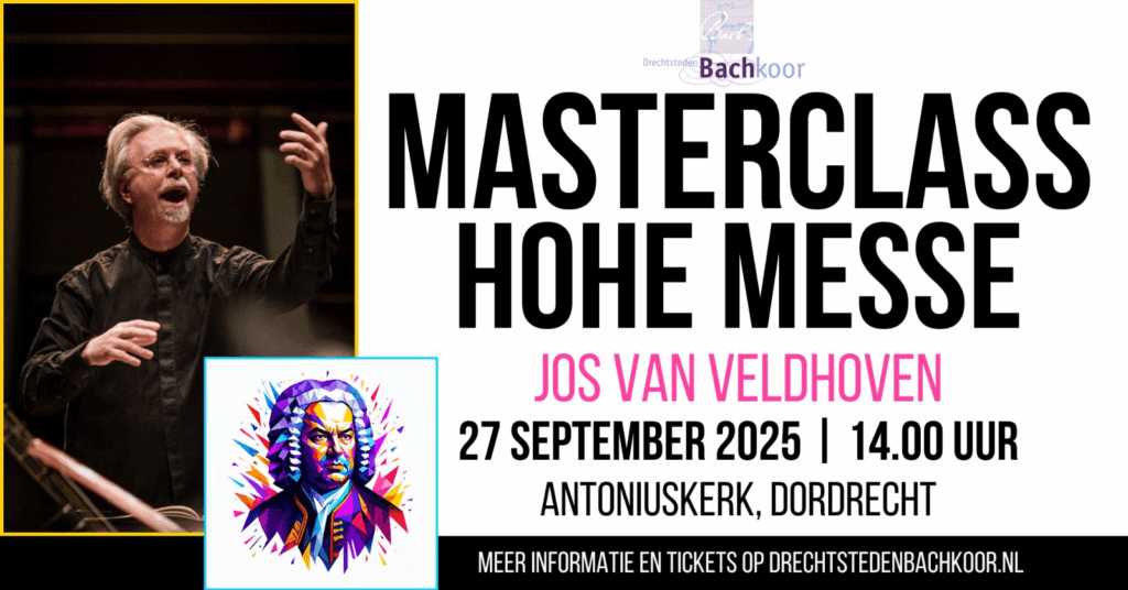 Voorafgaand aan dit concert organiseerden we een open Masterclass rondom de Hohe Messe onder leiding van Jos van Veldhoven in de Antoniuskerk in Dordrecht. Tijdens de masterclass kon u er als publiek getuige van zijn hoe Jos met het Drechtsteden Bachkoor werkt aan de Hohe Messe